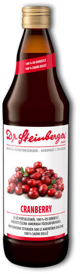 Dr. Steinberger Cranberry Tőzegáfonya Drs 750 ml100%-os, első préselésből kinyert direktlé. A frissítő, zamatos tőzegáfonya levének gyártásához kizárólag válogatott, észak-amerikai tőzegáfonyát használnak. A gyümölcsöt kíméletes eljárással préselik, hogy annak értékes anyagai a lehető legteljesebb mértékben megőrződjenek. Átlagos tápérték 100 ml-ben Kiszer
