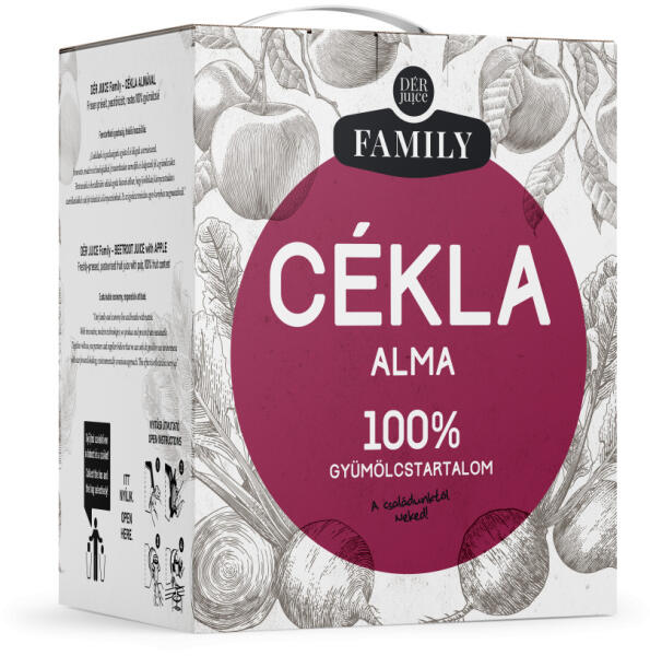 Frissen, hidegen préselt, pasztőrözött, rostos 100 % zöldség- és gyümölcslé. A rost kiülepedése természetes folyamat, amely a termék minőségét nem rontja. Felbontás előtt felrázandó. Összetevő: 70% céklalé, 30% almalé Természetes módon előforduló cukrot tartalmaz. Bontatlan csomagolásban minőségét megőrzi a doboz tetején feltüntetett időpontig (nap/hónap/év)
