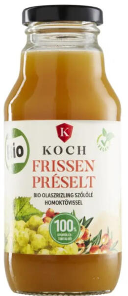 Koch bio frissen préselt fehér szőlőlé homoktövissel 330 ml Bio olaszrizling szőlőlé homoktövissel. Frissen préselt 100%-os rostos bio gyu¨mölcslé. Hozzáadott cukor, tartósítószer, színezék és adalékanyag mentes termék. A szőlőédeskés és a homotövis savanykás ízének harmóniája. A szőlő multivitaminja.