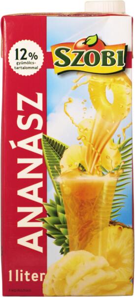 Szobi ananász üdítő 12% 1l Hivatalos magyarországi forgalmazótól. Leírás: Ananász ital 12% gyümölcstartalommal. Összetevők: Ivóvíz Ananász lé min. 12% (sűrítményből) Étkezési sav (citromsav) Aroma Édes tőszerek (ciklamátok, aceszulfám-K, szukralóz) Stabilizátorok (fagyanta glicerin-észterei, gumiarábikum) Színezék (karotinok) Gyümölcstartalom: min. 12%