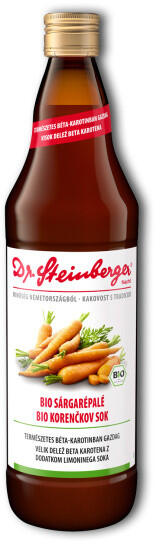 Dr. Steinberger Bio Sárgarépalé 750 ml Ökológiai termesztésből származó sárgarépából készül, kíméletes feldolgozással és préseléssel nyerik ki a sárgarépa levét, amely mindezeknek köszönhetően megőrzi és tartalmazza a zöldség értékes összetevőit. Béta-karotint tartalmaz (az A-vitamin provitaminja), amely a szervezetben A-vitaminná alakul át. Az A-vitamin egyik