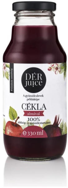 Dér juice cékla almával 70-30% 330 ml A DÉR Juice 100% natúr és környezetbarát, frissen préselt gyümölcslé - kizárólag finom és roppanós gyümölcsök kerülnek a papír címkével ellátott újrahasznosítható üvegpalackokba. A DÉR Juice semmiféle aromát, színezőanyagot, vagy hozzáadott cukrot nem tartalmaz. Az ízek hibátlan harmóniája a céklás almalében. A céklás