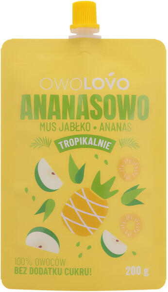 Owolovo gyümölcspüré alma-ananász 200 g 100% gyümölcspüré almából és ananászból. GMO mentes, tartósítószermentes. Pasztörizált termék. Hozzáadott cukor nélkül, alkalmas vegánok és vegetariánusok számára is. Összetevők: 80 % alma, 20 % ananász