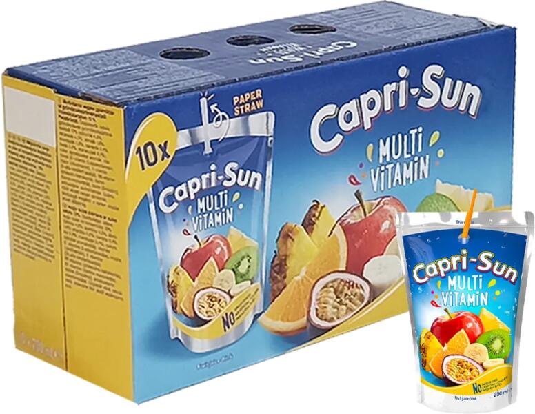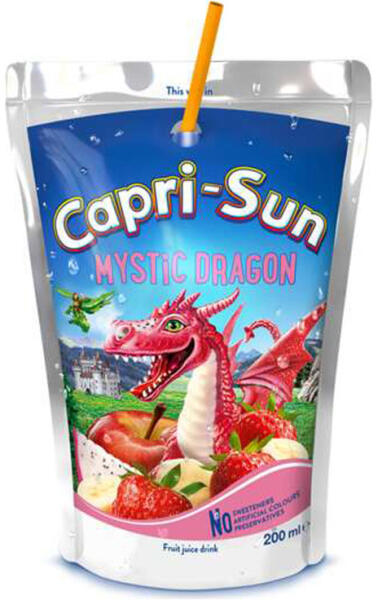 Capri-Sun mystic dragon vegyes gyümölcsital 200 ml Vegyes gyümölcsital, déligyümölcsökkel , sűrítményből, hozzáadott cukor nélkül. Összetevők: ívóviz, gyümölcslésűrítmény 10%, (almalé 9,3%, szamócalé 0,1%, banánlé 0,5%, pitajalé 0,1%, )