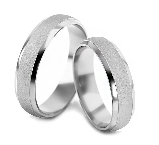 Fehér, aranyból készült jegygyűrűk, enyhén lekerekített profillal, a Fluent kollekcióból. Ezek a 4 - 6 mm széles karikagyűrűk belső lekerekített profillal rendelkeznek, a nagyobb kényelem érdekében. A gyűrűk központi díszét egy gyönyörű homokfúvott vonal alkotja, két premevonallal kiegészítve, amelyek felületi kezelése magasfényű. Amennyiben be szeretné gravíroz