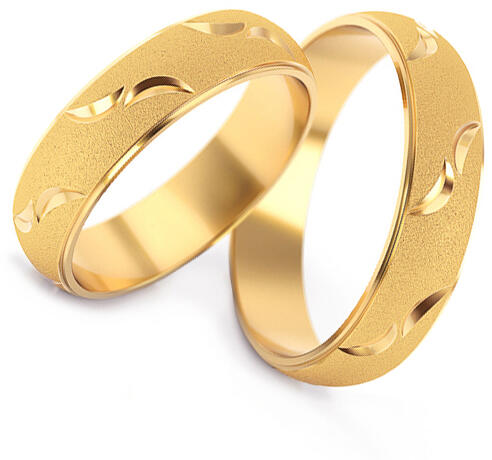 Sárga, aranyból készült jegygyűrűk, félkerek profillal, a Fluent kollekcióból. Ezek az 4 - 6 mm széles karikagyűrűk belső lekerekített profillal rendelkeznek a nagyobb kényelem érdekében. A gyűrűk dísze a homokfúvott felület, egy fényes hullámmintával kiegészítve. A feltüntetett ár egy párra érvényes!!! A jegygyűrűk méretét külön-külön, a kép alatt választ