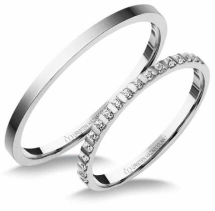 Gyémánt köves, fehér arany kararikagyűrű. Hagyományos stílusú, lapos külső profillal, fényes felülettel.