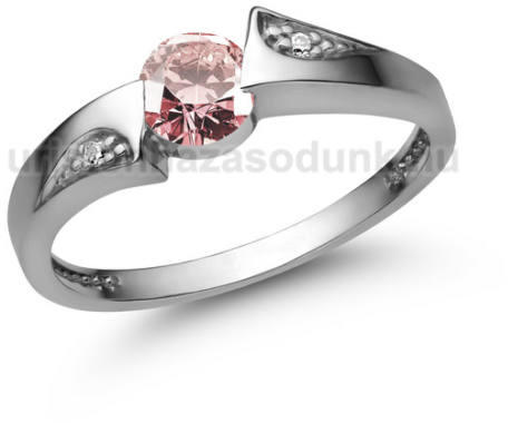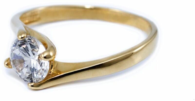 Klasszikus és kedvelt fazonú, ez a fejrészén magasított karmos foglalatban csillogó cikrónia kővel ékített, asszimetrikus kialakítású arany eljegyzési gyűrű.