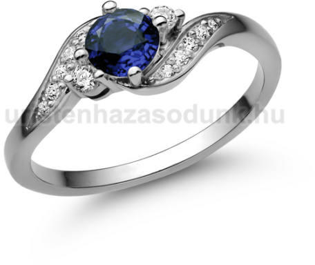 Nagy köves eljegyzési gyűrű, kék zafír kővel középen, oldalt több kisebb cirkónia kővel.