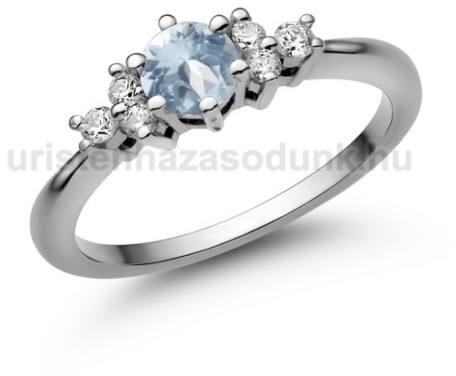 Nagy köves eljegyzési gyűrű, akvamarin kővel a közepén és 3-3 darab kísérő cirkónia kővel oldalt.