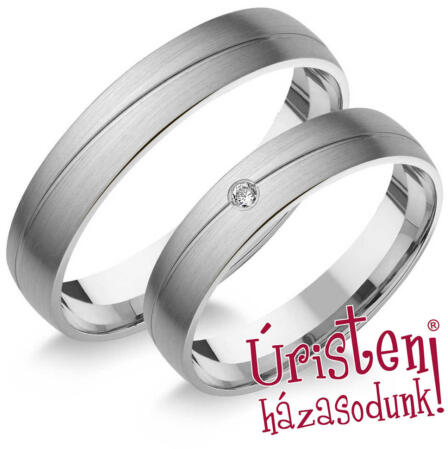 Klasszikus stílusú, fehér arany karikagyűrű, 4 mm széles sínnel, fényes és matt felülettel. A női gyűrű 3 cirkónia kővel díszített.