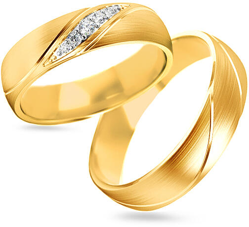 Selyemfényű, sárga arany karikagyűrű, matt felülettel, kívül-belül domború profillal. A női gyűrűt 3 cirkónia kő díszíti.