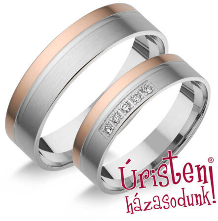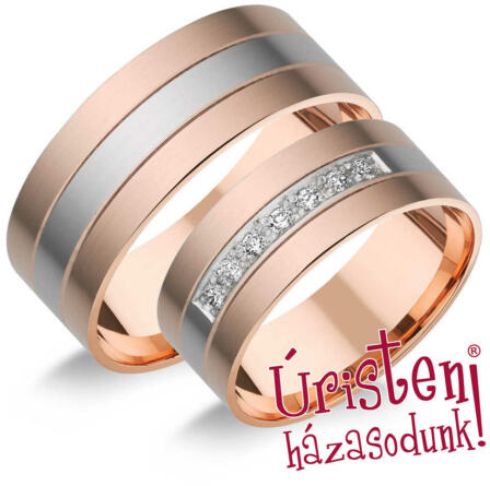 Klasszikus, vékony, sárga arany karikagyűrű. A női gyűrű 2 sorban gyémánt kővel ékített.