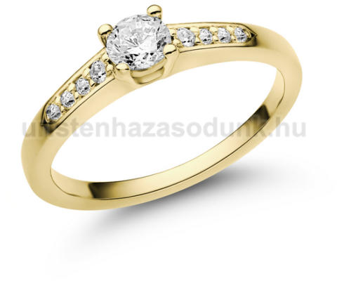 Sikkes, sárga arany eljegyzési gyűrű, középen 0.30 ct-os, briliáns csiszolású gyémánt kővel és további 8 gyémánt kővel oldalt.