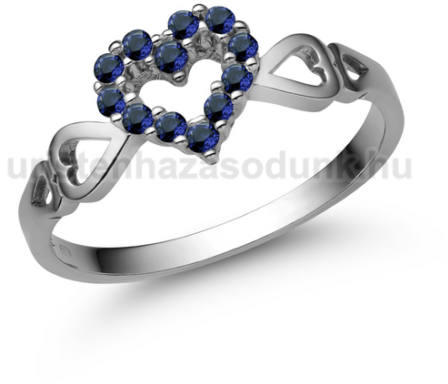 Modern formavilágú eljegyzési gyűrű, 7 darab briliáns csiszolású kék zafír kővel és 6 darab gyémánt kővel.