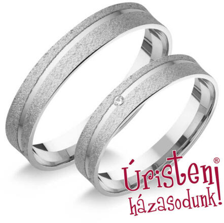 Design, fehér arany karikagyűrű, különleges, csiszolt felülettel, 4 mm széles sínnel. A női gyűrűt 1 cirkónia kő díszíti.