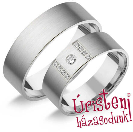 Matt felületű fehér arany karikagyűrű, vésésekkel. A női gyűrű 9 cirkónia kővel díszített, modern foglalatban.