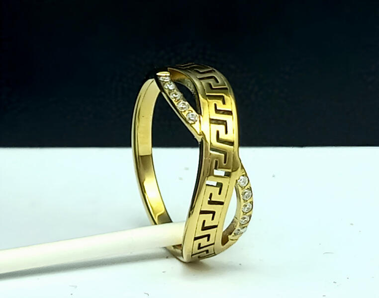 Aranyszínű nemesacél ( 316L ) gyűrű fehér cirkónia kristály és áttört görög minta díszítéssel. A kristályok ragasztott foglalatban helyezkednek el. Időtálló darab, nem feketedik, mindennapi viseletre is alkalmas. Antiallergén ékszer. 14K arany színben kapható. A nemesacél ékszerek rendkívül népszerűek kedvező tulajdonságaik miatt. A nemesacél semmilyen nikkelsót n