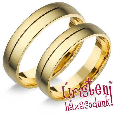 Vésett, kő nélküli, sárga arany karikagyűrű, fényes és matt felülettel, enyhén domború külső-belső profillal.