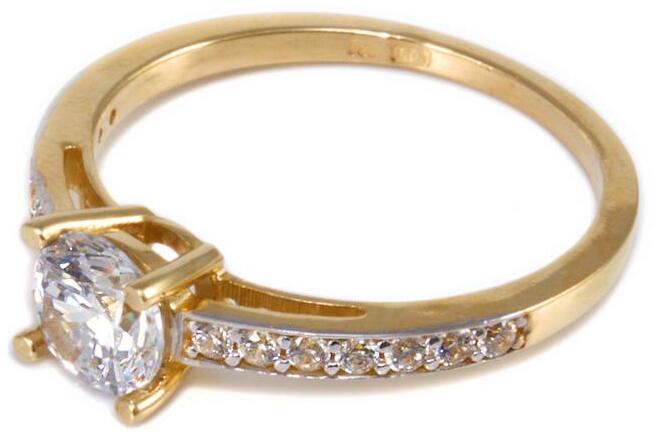 Modern stílusú, kedvelt fazonú, fejrészén és sínrészén csillogó cirkónia kövekkel ékített arany eljegyzési gyűrű.