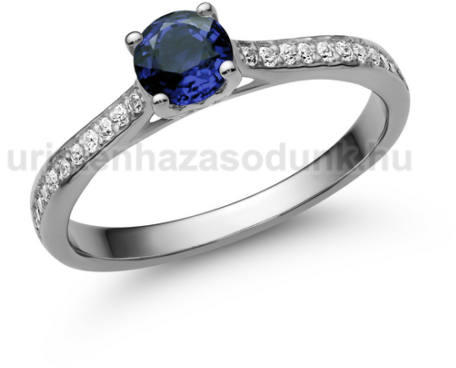 Sikkes, fehér arany eljegyzési gyűrű kék zafír kővel és gyémánt kövekkel oldalt.