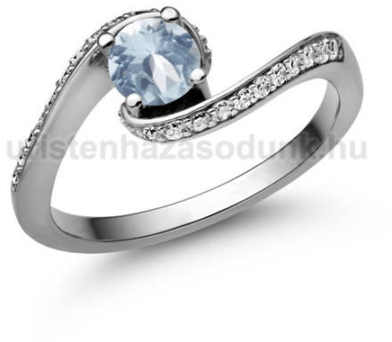 Extravagáns eljegyzési gyűrű, akvamarin kővel a középpontban, további 22 darab gyémánt kővel oldalt.
