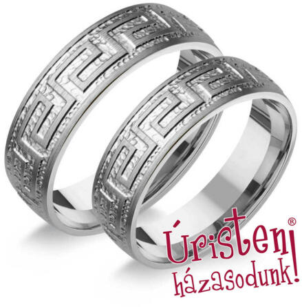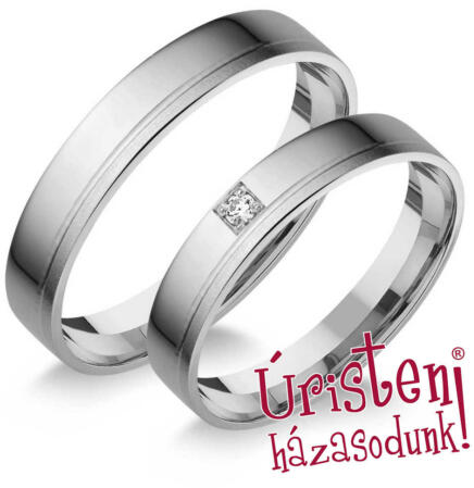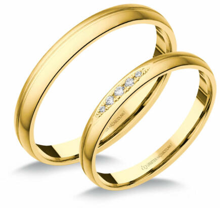 Vékony, sárga arany karikagyűrű, fényes felülettel, dombrú külső-belső profillal. A női gyűrű 5 cirkónia kővel díszített.