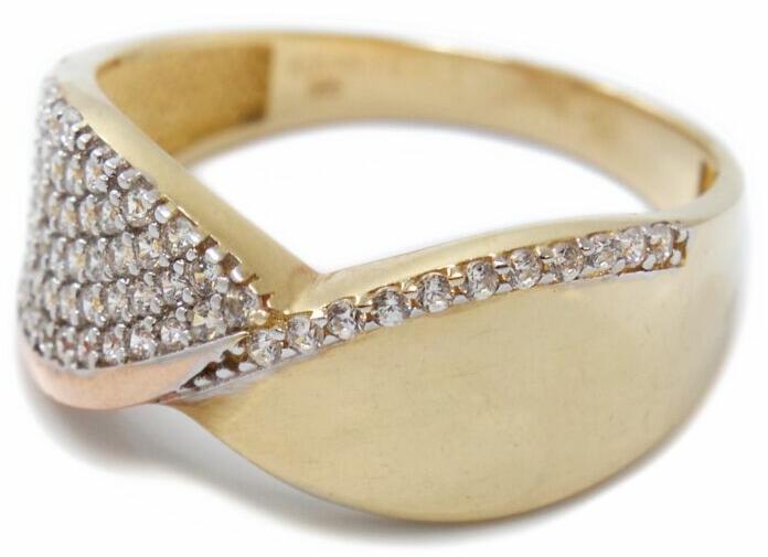 Modern stílusú, ródiummal, rozé aranyozással és cirkóniával ékített csavart mintás arany gyűrű.