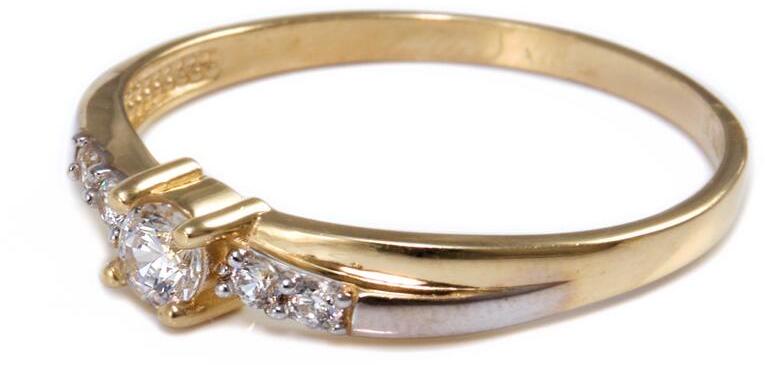 Klasszikus és kedvelt fazonú, karmos foglalatban középen nagyobb, mellette kisebb cirkónia kövekkel díszített arany eljegyzési gyűrű.