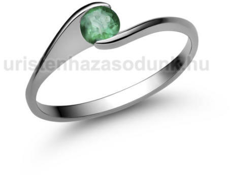 Csavart vonalú, fehér arany eljegyzési gyűrű, kerek formájú smaragd kővel.