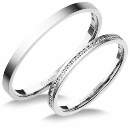 Gyémánt kövekkel ékített, hagyományos, fehér arany karikagyűrű. Vékony, 1.8 mm széles sínnel, lapos külső profillal.