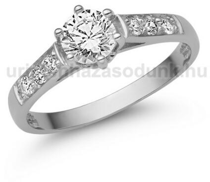 Modern, nőies fehér arany eljegyzési gyűrű 5 mm-es fehér zafír kővel középen és 3-3 gyémánt kővel oldalt.