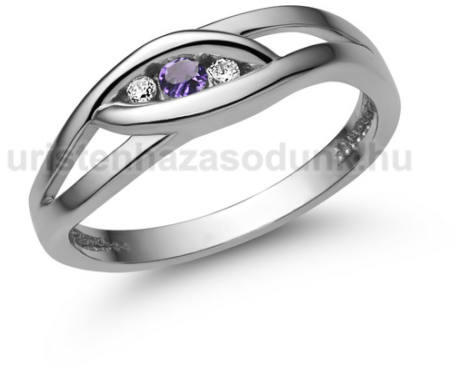 Praktikus viselésű fehér arany eljegyzési gyűrű ametiszt kővel és cirkónia kövekkel, mandula formájú, finom foglalatba zárva.