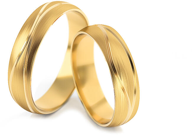 A sárga, 14 karátos aranyból készült jegygyűrűk a Fluent kollekcióból származnak, lapos profillal. Ezek az 5 mm széles karikagyűrűk belső lekerekített profillal rendelkeznek a kényelmesebb viselés érdekében. A gyűrűk központi díszét két összefonódott, magasfényű vonal alkotja, matt homokfúvott felülettel kombinálva. A jegygyűrűk méretét külön-külön, a kép a
