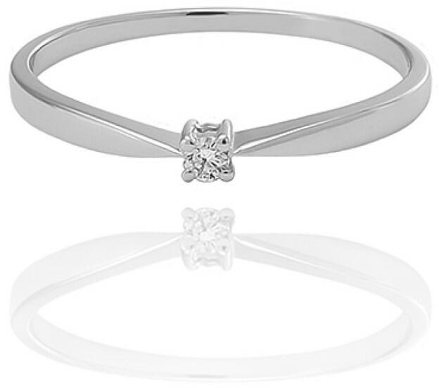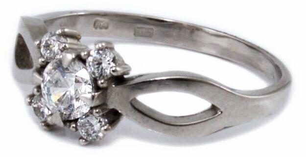 Modern stílusú, középen cirkónia kövekkel ékített, vállrészén áttört, ródiummal bevont arany eljegyzési gyűrű.