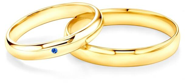 Fairytale esküvői karikagyűrűk: arany, kék zafír, félkarikás, 3 mm és 4 mm