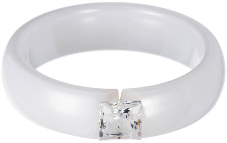 A fehér kerámia és a kristály ünnepi éke a kéznek. Több méretben is kapható. Fehér színű gyűrű, elegáns és modern darab, fehér kerámia anyagból, átlátszó cirkóniummal díszítve.