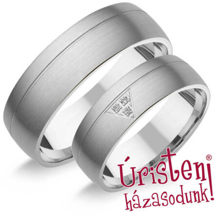 Vékony, hagyományos, fehér arany karikagyűrű. Külső lapos profillal, a női gyűrű cirkónia kövekkel díszítve.