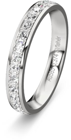 Széles és modern, fehér arany karikagyűrű, vékony véséssel. A női gyűrű 3 cirkónia kővel díszített, különleges foglalatban.
