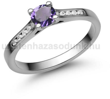 Modern, fehér arany eljegyzési gyűrű, 5 mm-es ametiszt kővel és 10 darab cirkónia kővel.