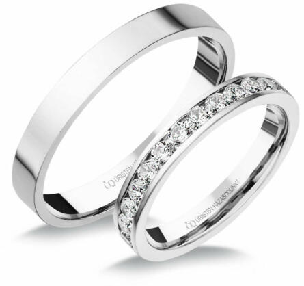 Cirkónia kövekkel díszített, hagyományos, fehér arany karikagyűrű. 3.2 mm széles sínnel, lapos külső profillal.