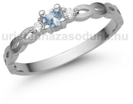 Finom, elegáns, 3 köves eljegyzési gyűrű, csavart, fehér arany foglalatban akvamarin kővel és cirkónia kövekkel.