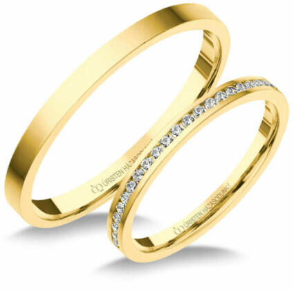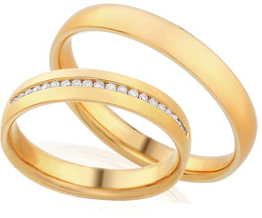 Az Ön esküvője napjára tökéletesek ezek a sárga, tizennégy karátos, magasfényű aranyból készült, csodálatos jegygyűrűk, félkerek profillal. A karikagyűrűk szélessége 4 mm, belső profiljuk lekerekített a nagyobb kényelem érdekében. A női gyűrű díszét húsz kiválóan foglalatba helyezett, csillogó gyémántból álló vonal alkotja, a kövek összsúlya 0,120 ct, sz