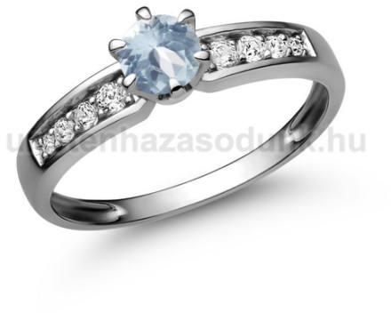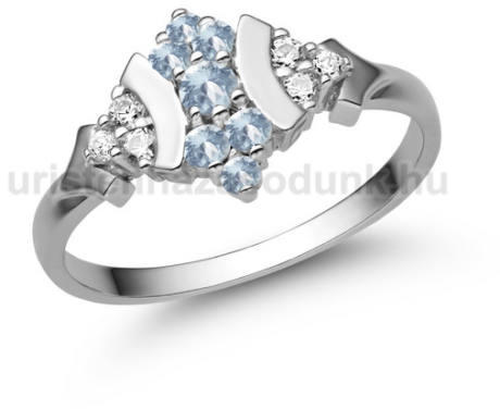 Modern formavilágú eljegyzési gyűrű 7 darab briliáns csiszolású akvamarin kővel és 6 darab cirkónia kővel.