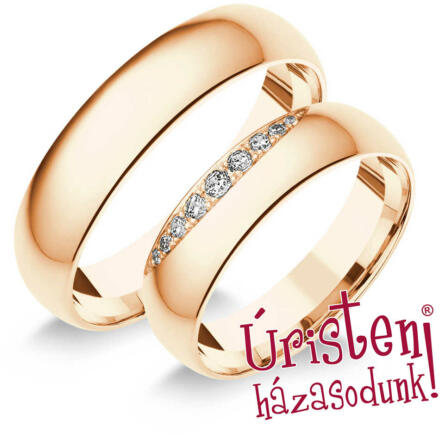 Kézzel készített, klasszikus, rozé arany karikagyűrű, domború profillal, 9 gyémánt kővel ékítve.