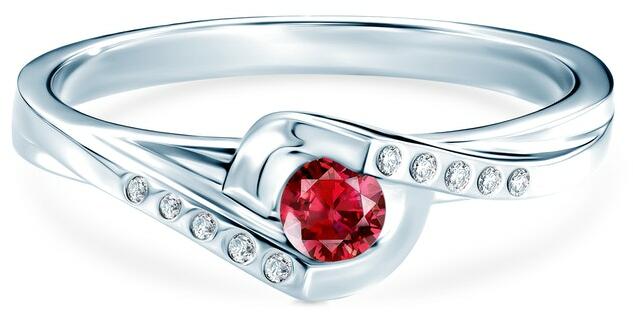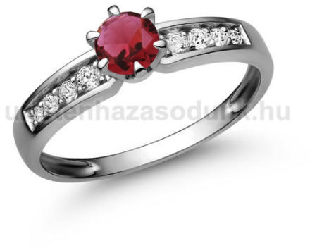 Exkluzív stílusú eljegyzési gyűrű, modern csiszolású rubin kővel, mellette 4-4 darab gyémánt kővel.