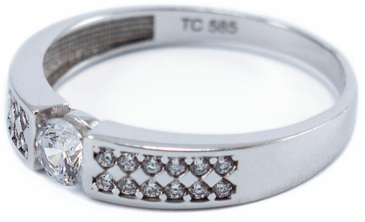 Modern kialakítású, cirkónia kövekkel és ródium bevonattal díszített női fehérarany gyűrű.