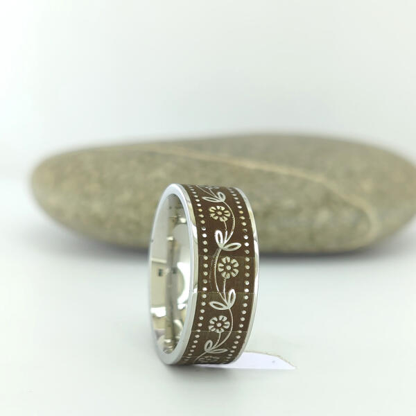 Ezüstszínű nemesacél (316L) virág mintával díszített gyűrű. Minőségi anyagának köszönhetően mindennapi használatra is alkalmas. Gyűrű szélessége: 8 mm. Antiallergén ékszer. A gyűrű belseje gravírozható. A nemesacél ékszerek rendkívül népszerűek kedvező tulajdonságaik miatt. A nemesacél semmilyen nikkelsót nem bocsájt ki magából, ennek következtében teljese