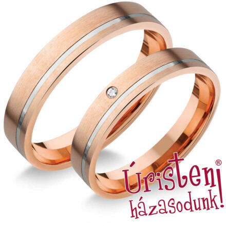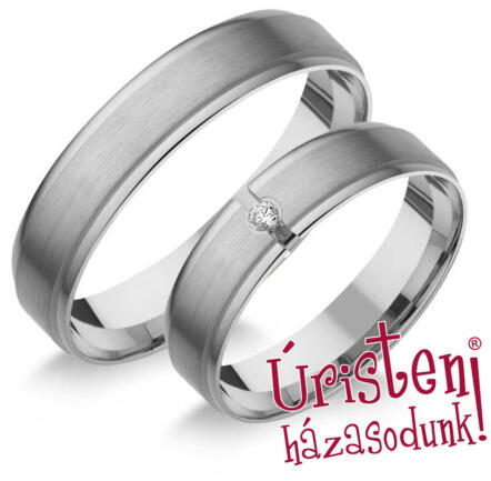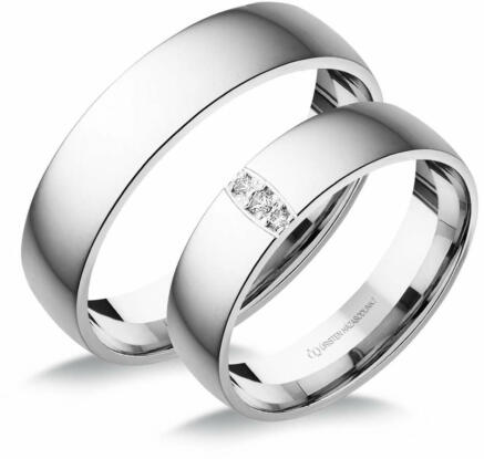 Fehér arany karikagyűrű, 5 mm széles sínnel, a női gyűrű gyémánt kővel ékített.