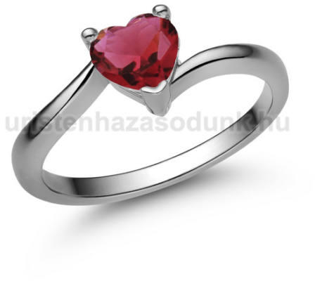 Szív formájú, rubin köves eljegyzési gyűrű, fehér arany foglalatban.